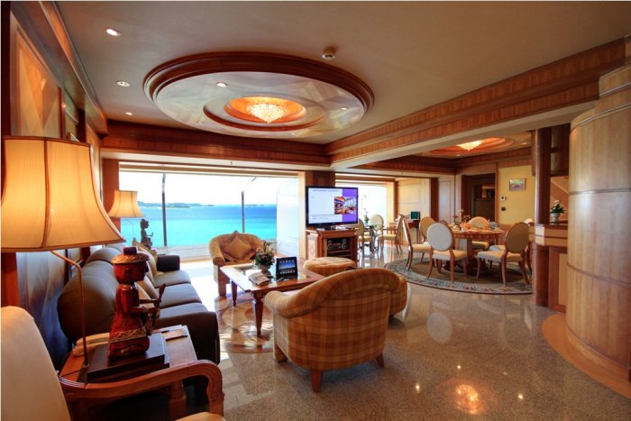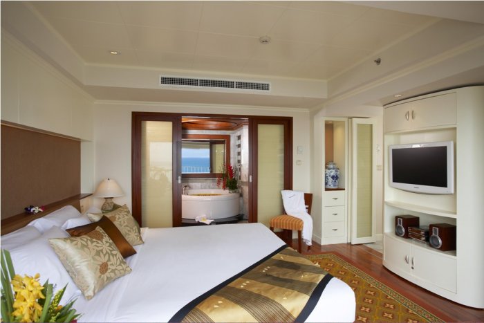 2 astoņistabu three bedroom Presidential suite (3 guļamistabas ar atsevišķam izjām un durvīm, 3 vannas istabas, 2 viesistabas, ēdamistaba + atpūtas zona, kabinets, 6 blakoni, 3 televizori, ekstra tualete, maks. 6+2 cilv, 221 m2, personiskā sulaiņa pakalpojumi un atsevišķs pludmales paviljons jūras krastā ).