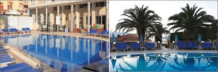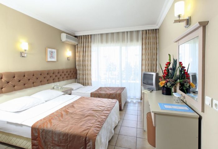 Отель: расположен в 90 км от аэропорта г. Даламан, в 1,5 км от центра г. Мармарис, на берегу моря. Построен в 1996 году, общая площадь составляет 9.000 м2, последняя реновация проведена в 2006-м. Cостоит из четырех 5-ти и 6-ти этажных блоков: 195 standard room (макс. 2+1 или 3 чел., 24 м2); 1 family room (одна большая спальня, макс. 2+2 чел., 35-42,50 м2).