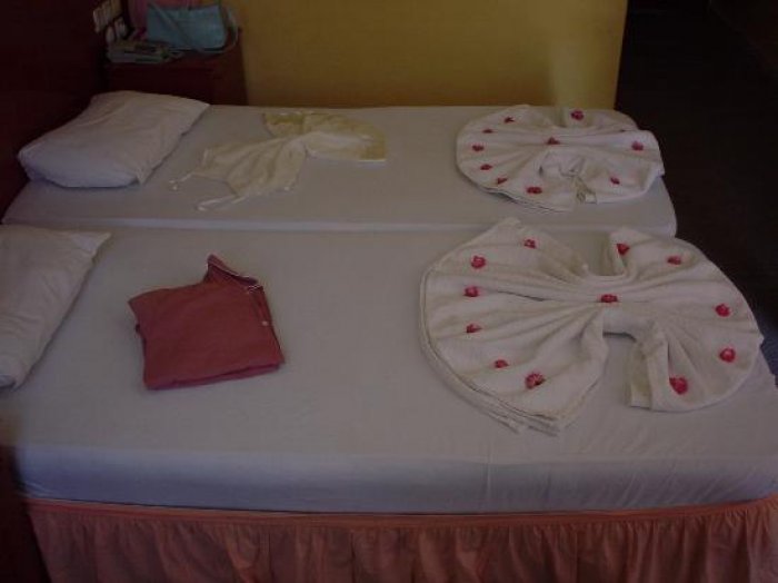 Pludmales dvieļi: nav. Pie baseina: saulessargi, atpūtas krēsli, matrači – bez maksas.